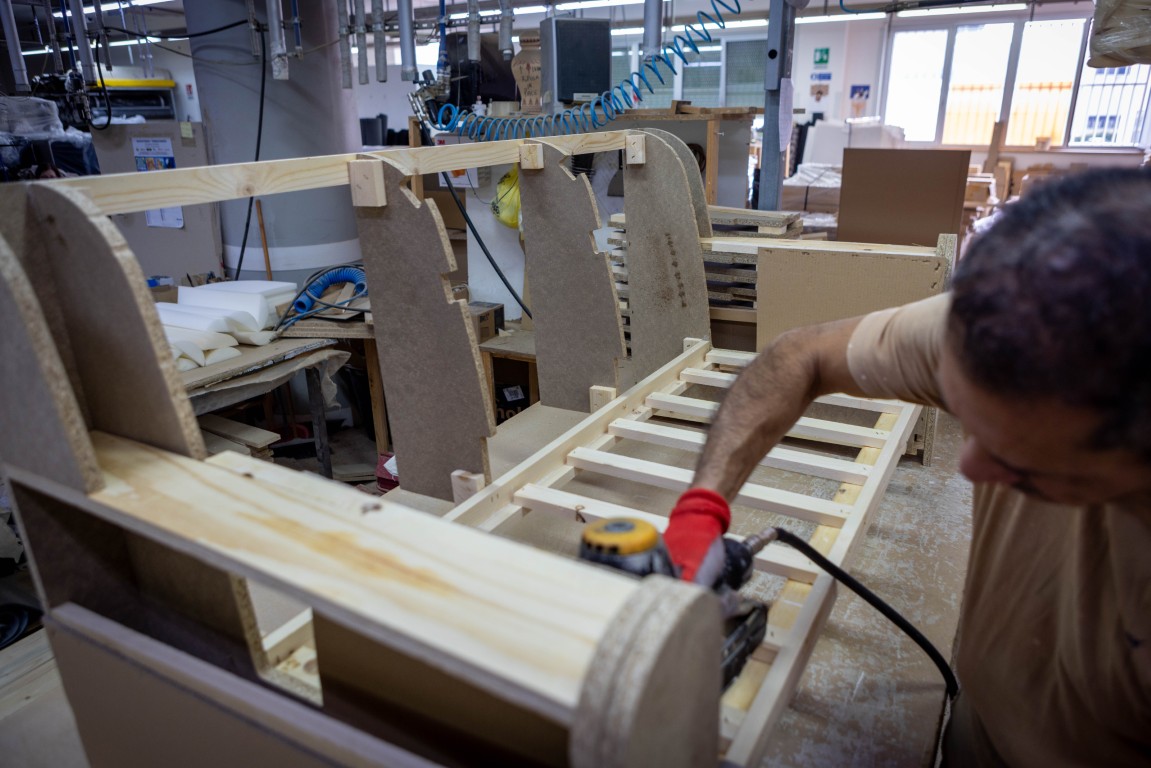 Ogni elemento dello scheletro viene tagliato, levigato e assemblato manualmente dai nostri artigiani, seguendo metodi tradizionali uniti a tecniche moderne di rinforzo. Questa lavorazione consente di ottenere una base solida, priva di vibrazioni e in grado di sostenere correttamente l’imbottitura e il rivestimento finale.